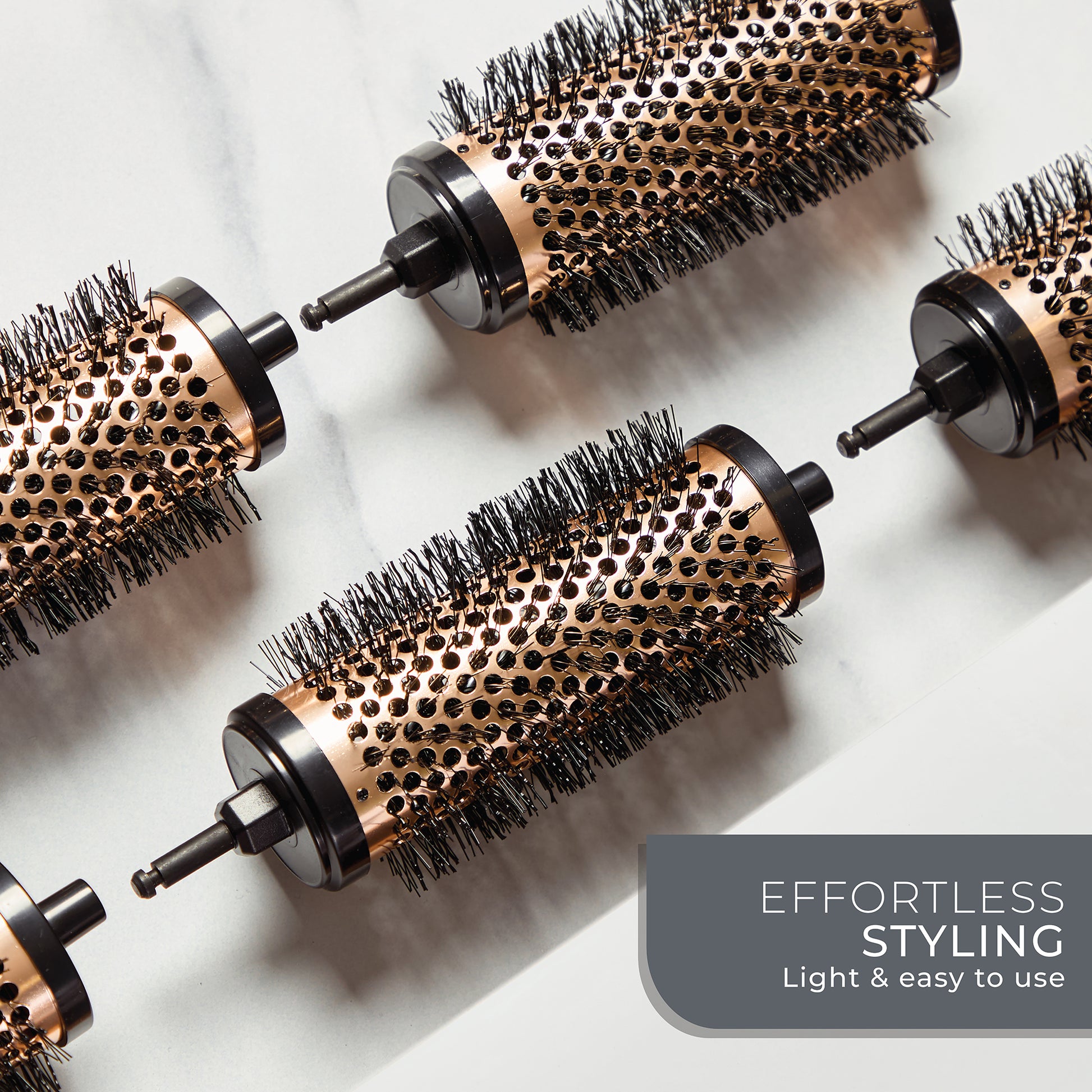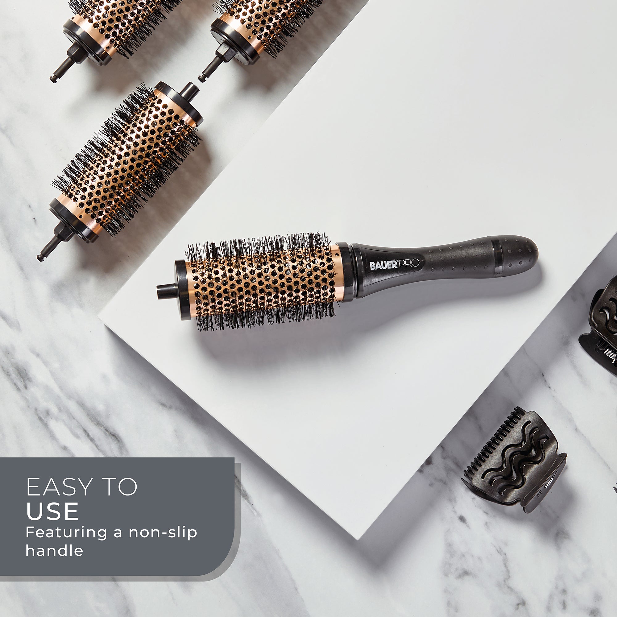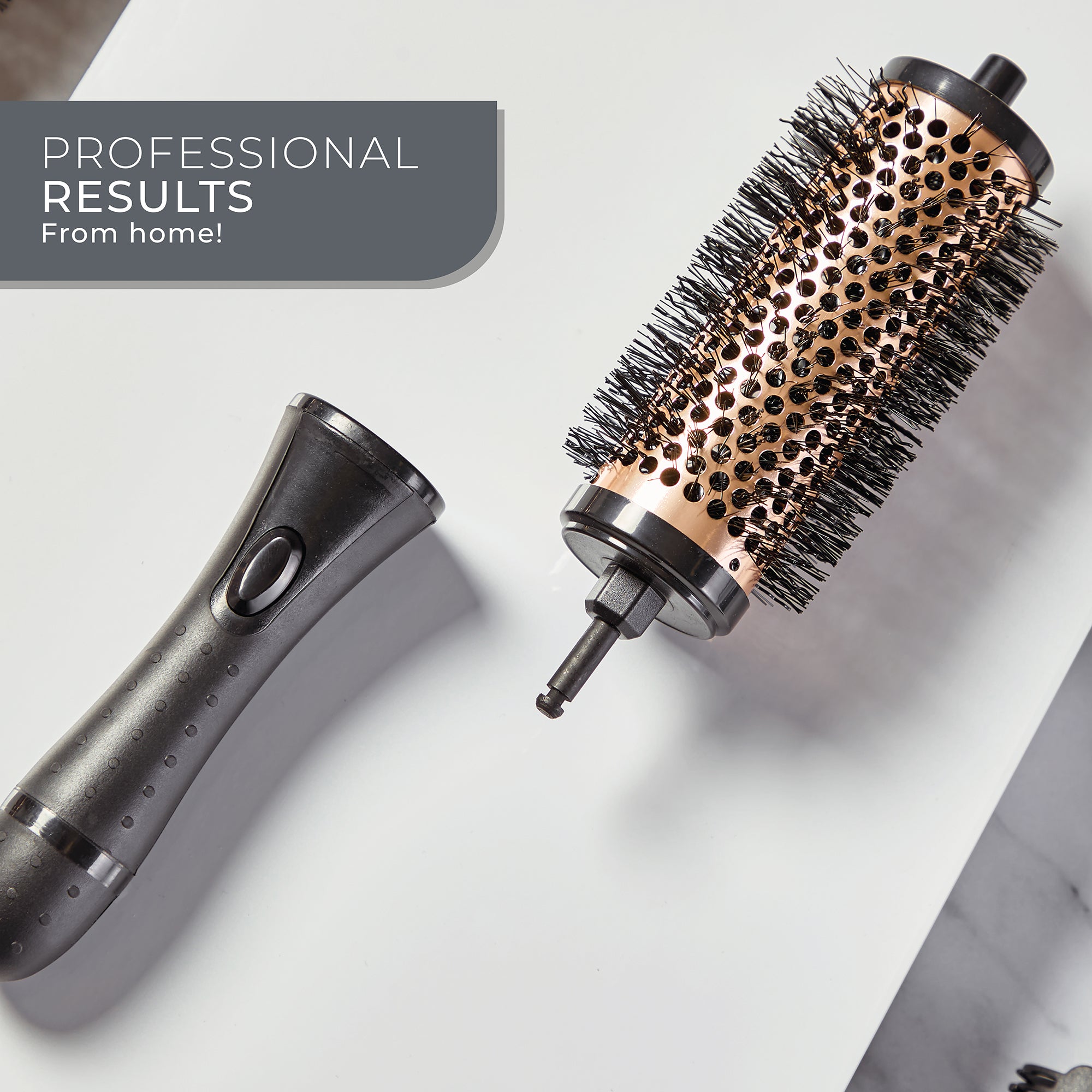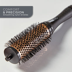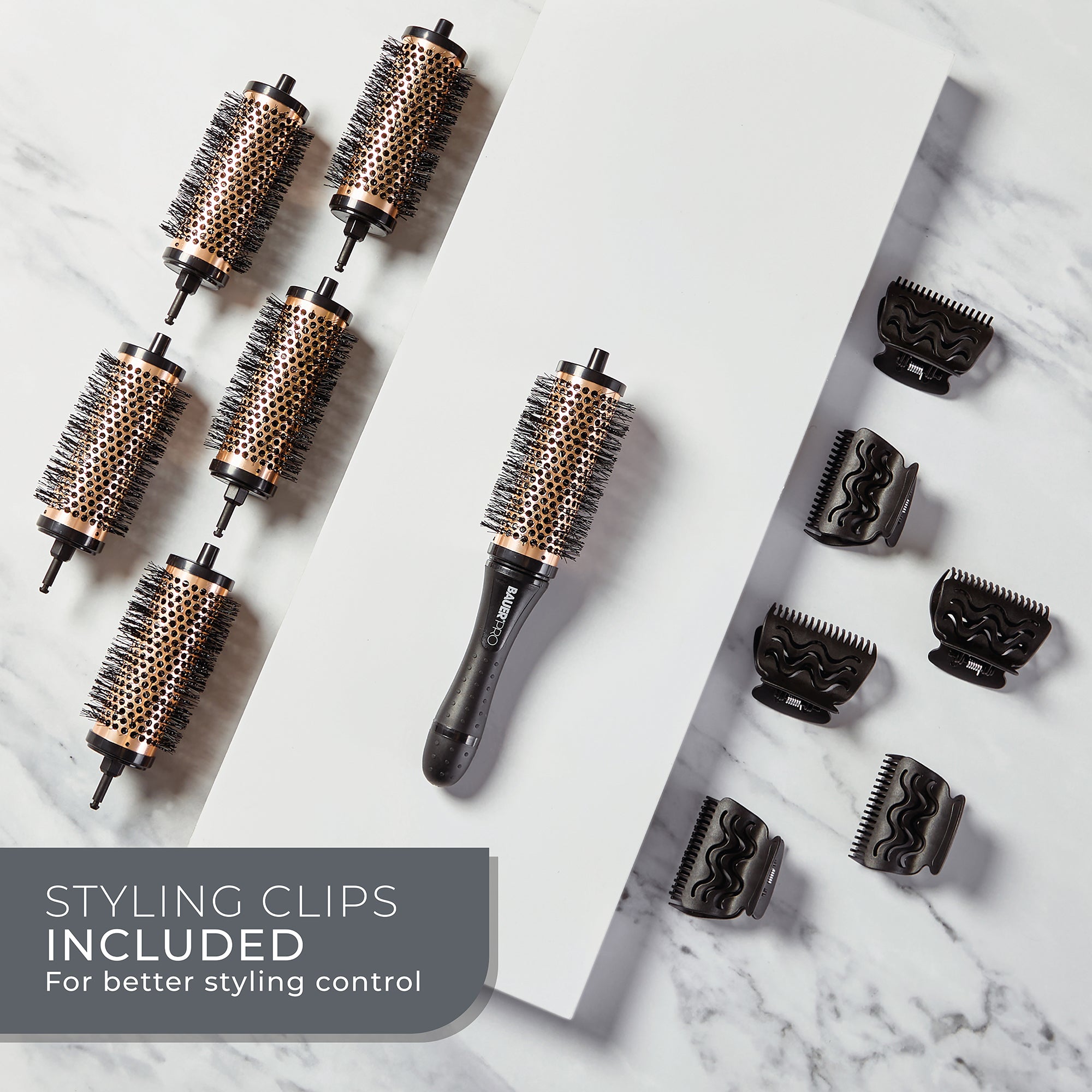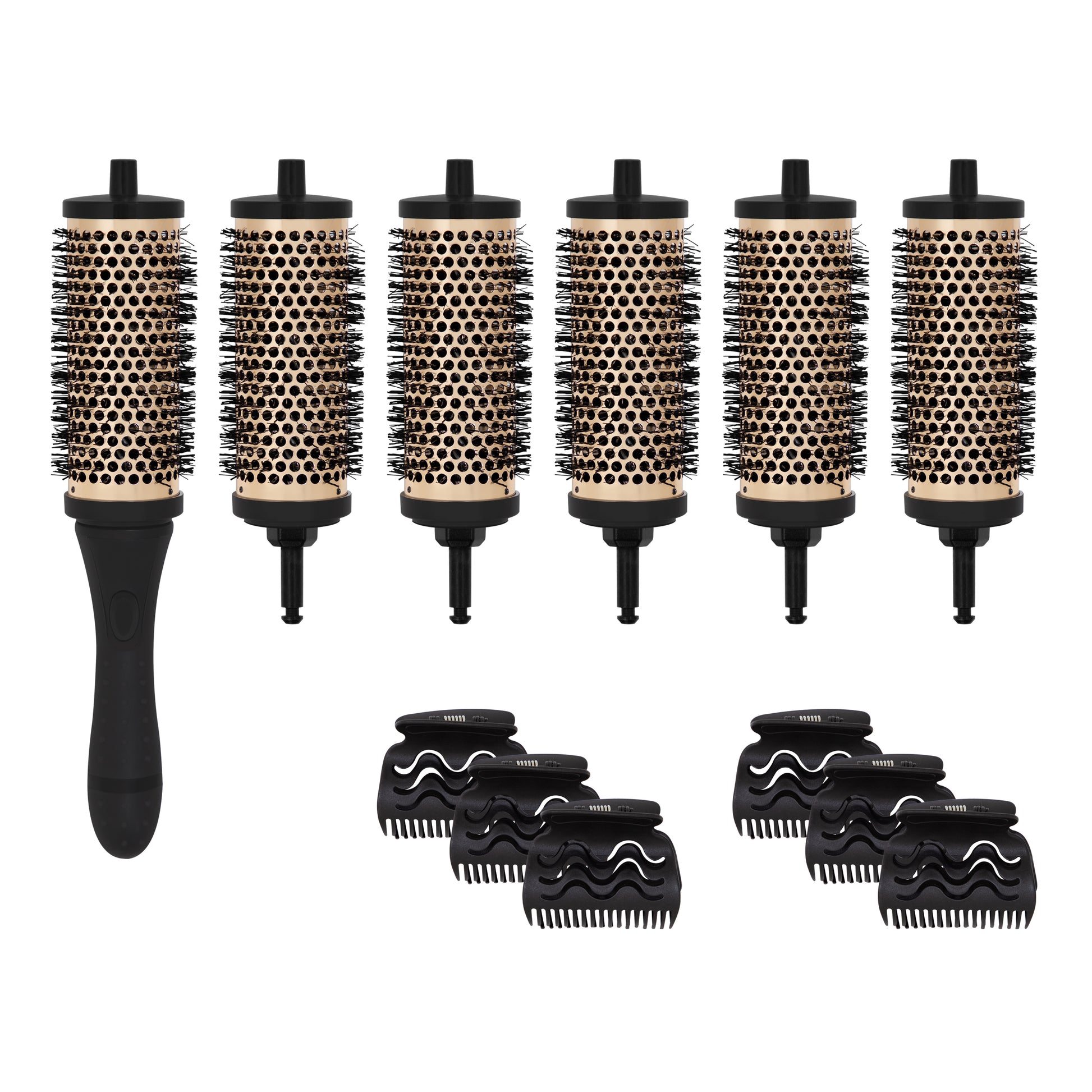 PROFESSIONAL RESULTS AT HOME – Achieve volume, curls, and bounce with this 2-in-1 styling set. It features a comfortable grip handle with 6 interchangeable 38mm round brush barrels, and 6 styling clips.